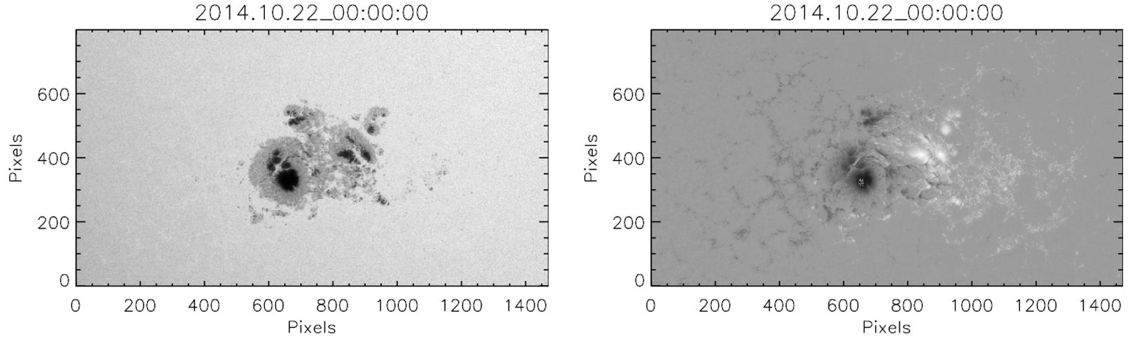 Figure 1| The left-panel presents a detailed, high-resolution image of Active Region NOAA~12192, as observed in visible light. The right-panel displays a corresponding magnetogram of the same solar region. In this magnetogram, areas of opposing magnetic polarity are clearly distinguished, with one color representing positive polarity and the other representing negative polarity.