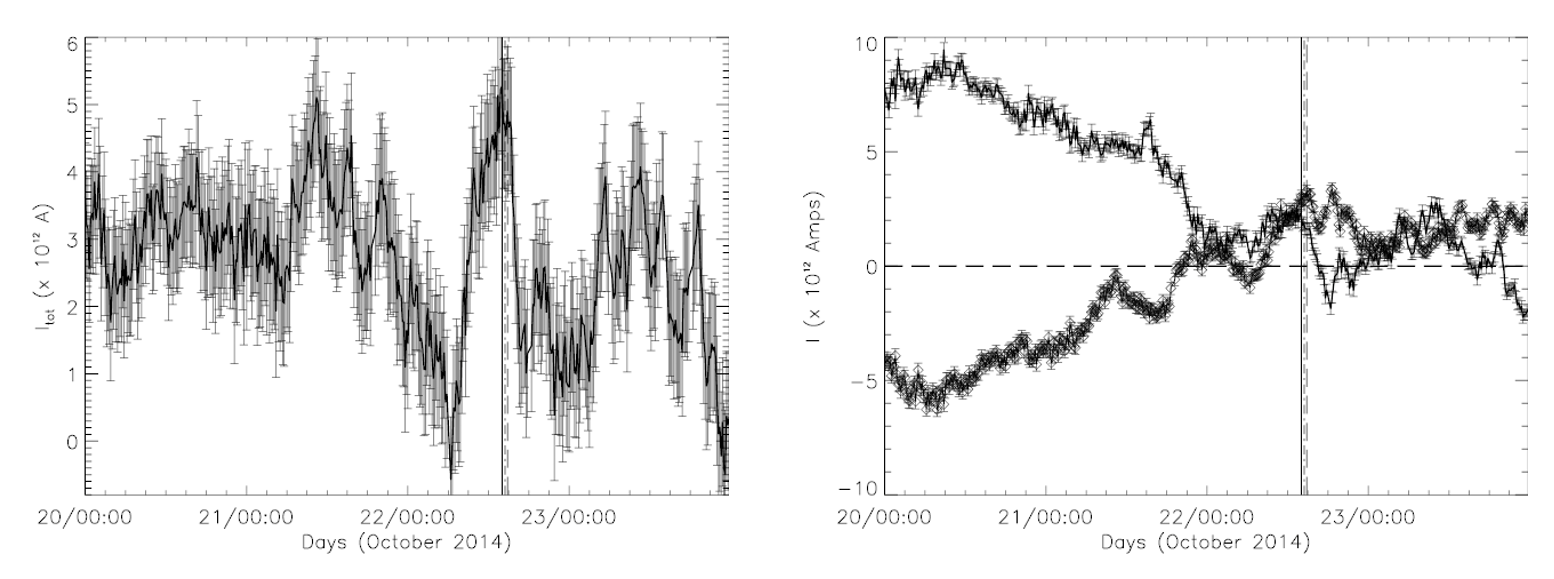 In October 2014, the exceptionally large active region NOAA 12192 (Figure 1) produced a record-breaking sequence of flares but surprisingly no significant CMEs[3]. This region, with its complex magnetic structure, unleashed an X1.6 class flare on October 22nd, which was studied using high-resolution magnetograms and EUV images. Analysis of the total vertical current within the active region revealed that it remained relatively stable for a couple of days before increasing around mid-October 21st (Figure 2 (left)). Interestingly, the current’s orientation reversed in the early hours of October 22nd, growing significantly in strength, and the powerful X1.6 flare occurred precisely when this total current peaked at 5 Terra Amps, subsequently decreasing after the event. This suggests a link between the accumulation of magnetic free energy, reflected in the electric current, and the release of energy during the flare.