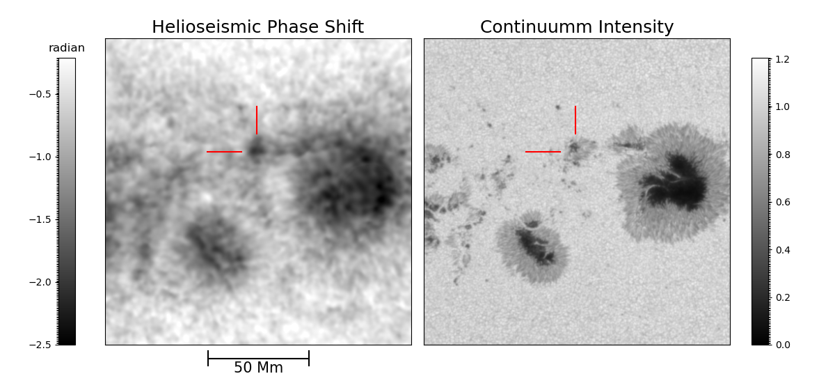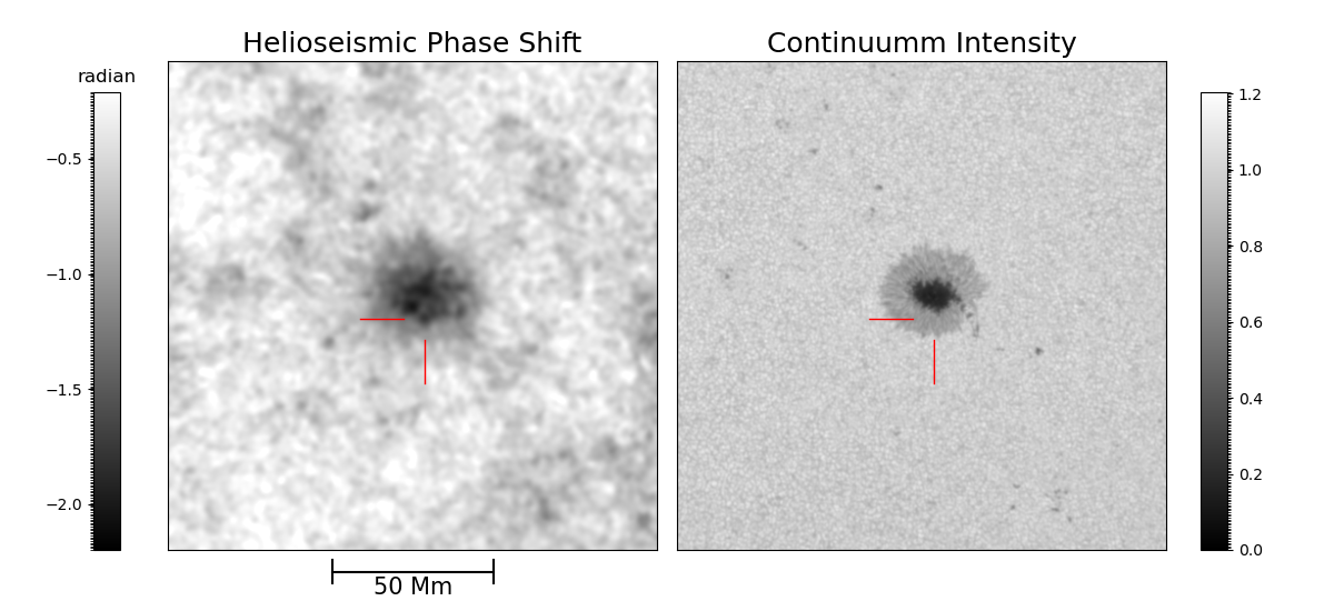 Figure 1. Acoustic phase map (left frame) of a small, isolated sunspot is made by applying phase-correlation helioseismic holograhy, to a 24-hour timeseries of helioseismic observations of NOAA AR12289 centered at 2014-11-10.0 by SDO/HMI. Right frame shows a concurrent co-spatial HMI continuum intensity snapshot of the same. Red reference fiducials locate one of the anomalies in the southern penumbra of the sunspot. A more detailed depiction of how helioseismic holography works is available here .