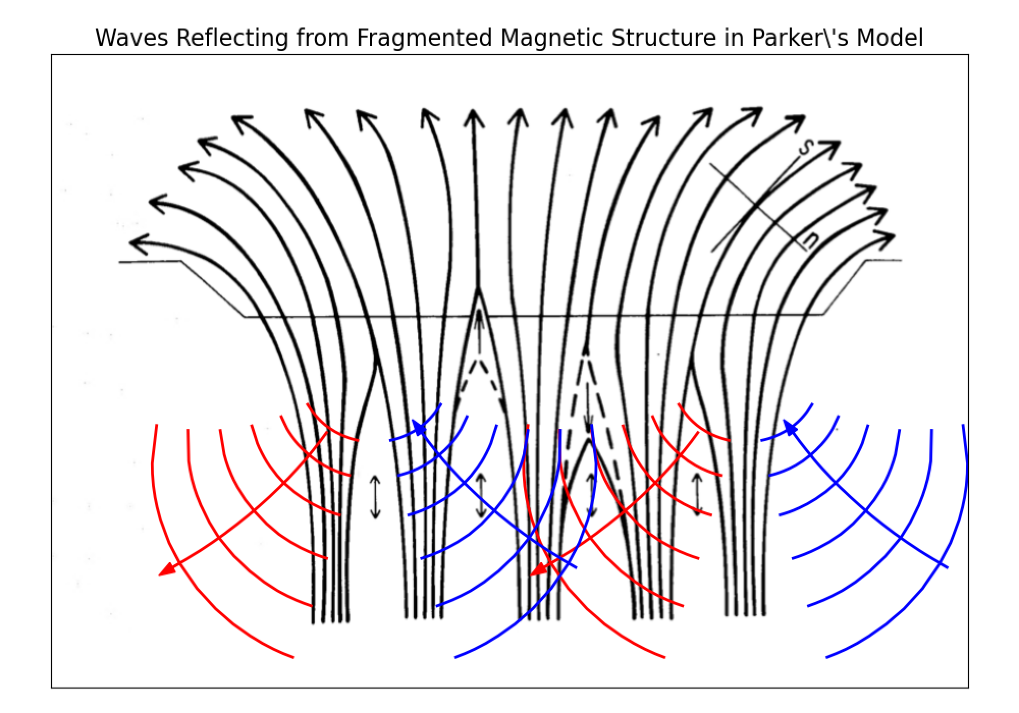 Figure 3. Diagram of Parker’s model of fragmentation of magnetic flux beneath the opaque photospheres of sunspots. Hot nonmagnetic gas trapped between magnetic flux strands and under a cool overlying magnetic monolith are unstable to vertical oscillations (two-way vertical arrows). The oscillating hot columns punch momentary holes in the seams of the magnetic monolith, releasing a fraction of their energy into space. Most of the rest is converted to acoustic waves that propagate downward, carrying the blocked energy, somewhat ironically, downward, an unknown distance back into the solar interior, where it is dissipated into heat, and from whence it takes weeks, possibly longer, for it to return to the surface by convection. Blue and red curves represent to scale the species of incoming (blue) p-mode waves and their outgoing echos (red), whose surface signatures observed by the SDO, outside of the sunspot domain, are reconstructed and correlated to give us the acoustic maps shown in Figures 1 and 2, above.