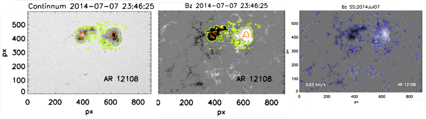 Figure 1. Left: Continuum intensity image of AR 12108. Center: Magnetogram of the same AR at the same time. The orange contours roughly trace the boundary between penumbra and umbra (1500 G) and the green contours trace the approximate outer penumbral boundary (200 G). Right: Horizontal velocity vectors overlaid on the Bz magnetogram, the longest arrow measures 0.53 km/s.