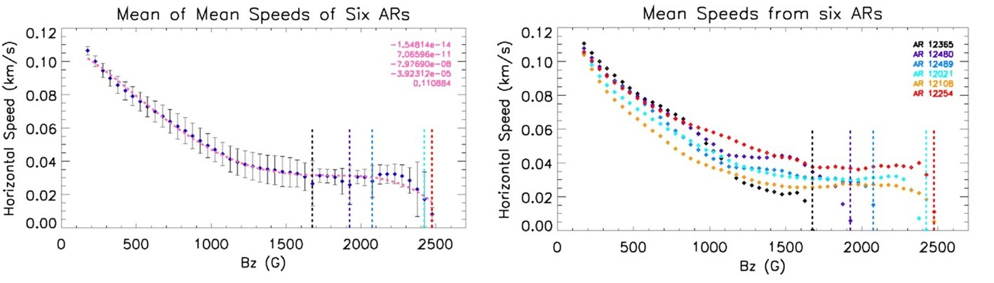 Our result of the average of the horizontal speeds measured using six ARs are shown in Figure 2. It shows quantitatively the suppression of the horizontal velocities due to the vertical magnetic field. Each blue diamond in the plot is the mean horizontal speed in a 50 G wide bin in each frame of the 24-hour observation of the six ARs averaged. The highest speeds in the curve are seen at quiet regions above 150 G and measure around 110 m/s and the lowest are in the sunspot umbra around 10 m/s. The speeds are low in general and are characteristic of slower features, which are most evident at lower cadences. Similar analysis performed on HMI line-of-sight magnetograms at cadences 12-minute, 6-minute, 3-minute and 45-seconds show increasing magnitudes of speeds with cadence, suggesting that increasingly shorter lived and smaller-scale features are tracked with increasing cadence. Examples can be found in Ref. [3].