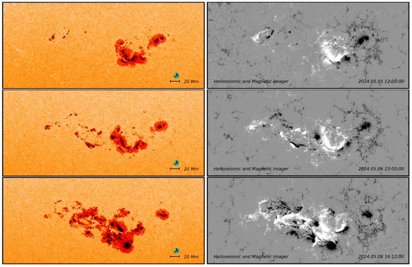 Figure 2. Small-scale evolution of AR13664/8 is shown with three snapshots from HMI continuum (left) and radial magnetic field(right). (see also https://aasnova.org/2025/07/28/featured-image-mothers-day-superstorms/ ).