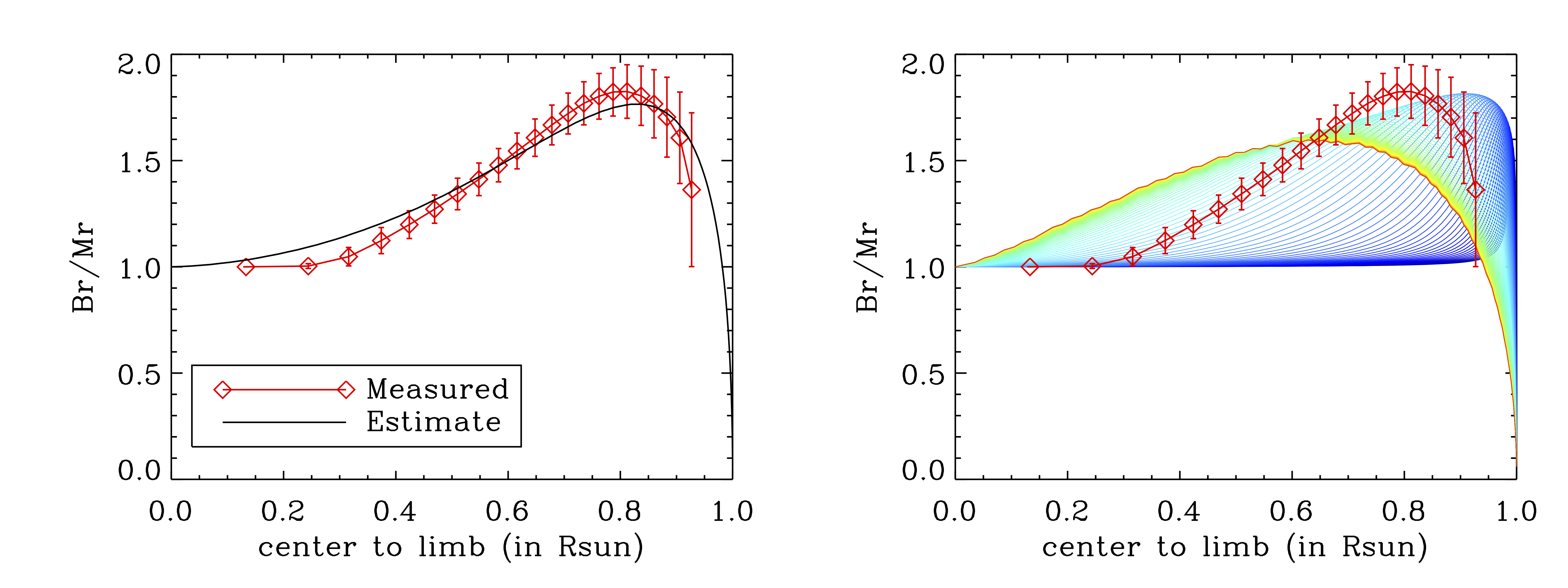 Figure 3 | Left: The ratio of Br/Mr as a function of center-to-limb distance from a numerical simulation in black and observations in red diamonds. The FWHM for this experiment is 85◦. Right: Br/Mr as a function of center-to-limb distance from various simulations with different FWHM of the Gaussian functions in rainbow. Overplotted with red diamonds is the Br/Mr measured from data. The range of FWHM is from 0.1π (blue curve) to 10π (red curve), effectively approaching a uniform distribution.