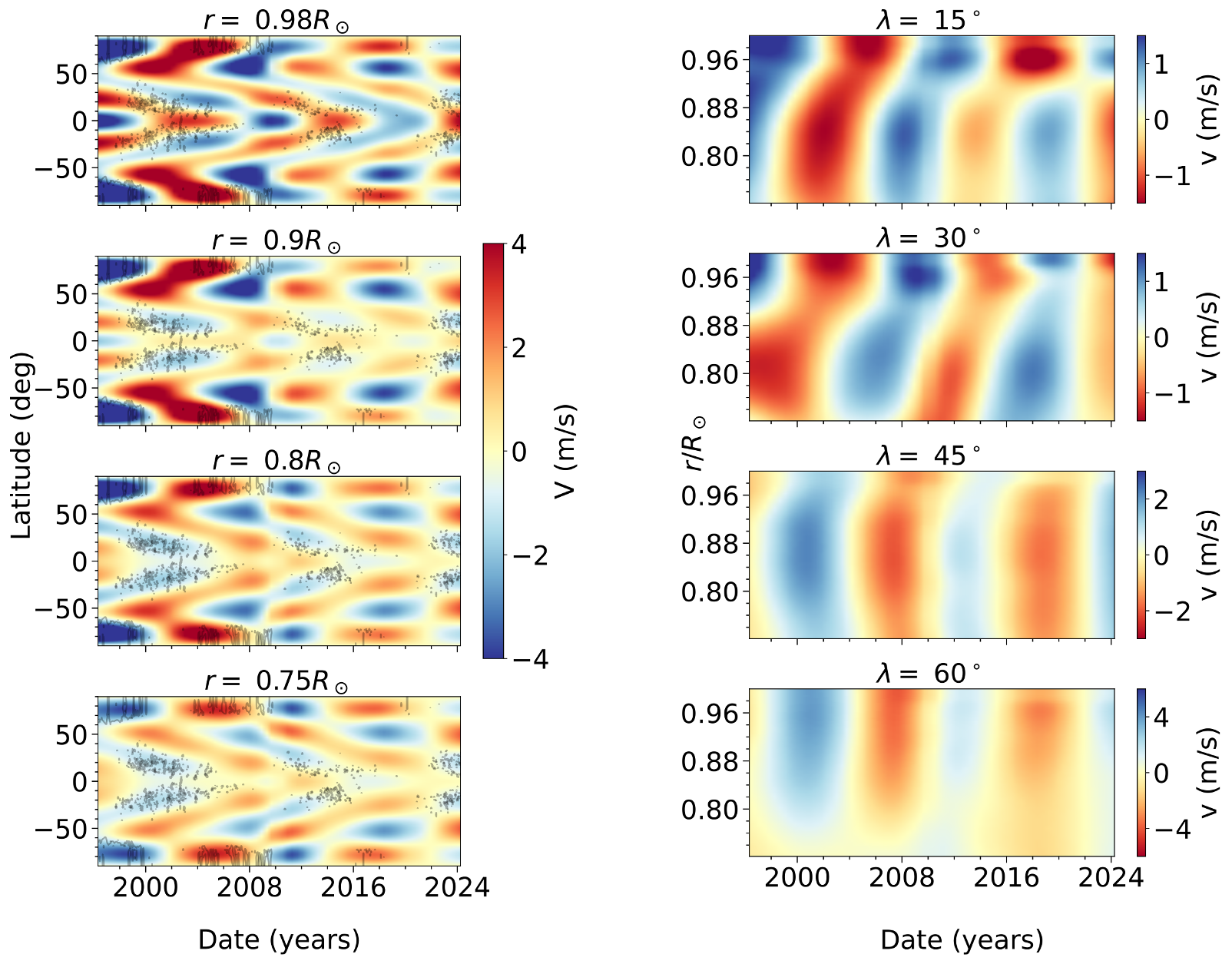 Our analysis reveals a dynamo-wave–like signature in the evolution of solar torsional oscillations. The signal appears to originate at intermediate latitudes (approximately 45°–60°), after which one branch migrates equatorward. This equatorward-propagating branch takes time to reach the surface, producing a characteristic slanted structure in radius–time diagrams at low latitudes (see right panel off Figure 1). In contrast, the high-latitude branch propagates more rapidly. A movie illustrating the propagation of the dynamo-wave–like signature in solar torsional oscillations is available in the online version of our recent publication [1] (click here to access the movie link). This behavior is qualitatively consistent with the dynamo wave propagation proposed by Parker, whose theoretical work describes how magnetic fields may propagate within the solar interior. These results are based on frequency splitting measurements obtained from data provided by Global Oscillation Network Group (GONG), the Solar Dynamics Observatory/HMI, and the Solar and Heliospheric Observato-ry/MDI instruments.