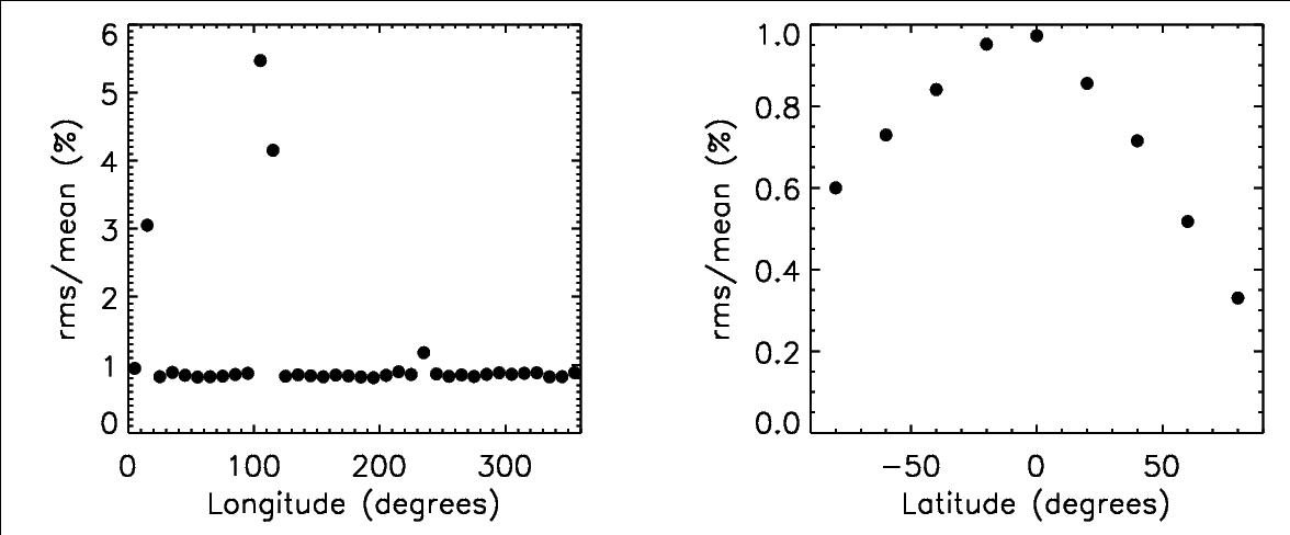 latitude and longitude for the intensity synoptic chart CR 2146. Left panel represents the rms of pixels